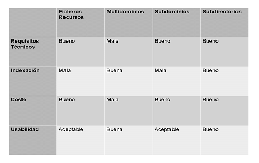 Requisitos técnicos, aquí incluímos las tareas necesarias para implementar este tipo de solución, como su posterior mantenimiento. Indexación, la mejor o peor adaptabilidad de ese tipo de web a los buscadores. Coste, aparte del tiempo de desarrollo, qué inversión económica tendremíamos que hacer si elegimos este tipo. Usabilidad, ventajas e inconvenientes para los usuarios cuando se encuentre con este tipo de solución. La calificación será de «buena/o» cuando sea la mejor solución según el criterio, «aceptable» entiendo como ni la mejor o peor solución y «mala/o» en el caso de ser la menos cualificada para el criterio.